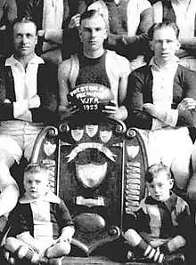 Adams came to Melbourne in 1923 to play with Fitzroy, but was refused a clearance by South Fremantle and instead became captain-coach of Preston in the Victorian Junior Football Association (pictured right with John Wren Shield as premiers).