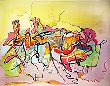 Inspired by the light and colors of New Mexico, and by Arshile Gorky, Fernand Léger, and Jean Arp, Barrett began painting in 1992.[11] His vibrant paintings quickly became an important part of his entire creative process—they complemented and influenced the free-flowing feel of his sculptures.[12] Drawing—rhythmic contours and marks—maintained a central role in the creation of his paintings and sculptures.[13] Since 1992, Barrett has had a number of solo exhibitions, featuring both painting and sculpture.[14] In 2010 Barrett exhibited paintings and sculptures in two separate shows: Polyphonic Abstractions: Painting and Maquettes by Bill Barrett at the Christian Petersen Art Museum at Iowa State University, and Synchronicity at Kouros Gallery in New York City.[15]