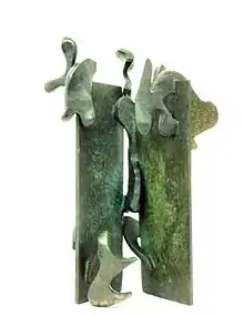 Barrett started working with bronze as a way to explore increasingly fluid and gestural forms. As his interest in expressive forms grew, Barrett found that wax gave him the creative freedom to model shapes. He created a technique of pouring wax into a baking tin, drawing the shapes in the wax, and then combining the shapes to create a model, twisting and carving away at each shape by hand. The most successful models were cast into bronze and the bronze maquettes were then fabricated into larger bronze sculptures.[8] From the '90s on, Barrett's bronze works took on a free-flowing quality that suggested calligraphy, movement, dance and music. Several sculptures from this decade refer directly to dance.[9] In May 2011, Barrett installed a bronze sculpture in New York City's Tribeca neighborhood, for temporary display, as a memorial to September 11, 2001.[10] In addition, the artist's small sculpture "Lexeme VII" is part of the 911 Memorial and Museum's permanent collection in New York City.