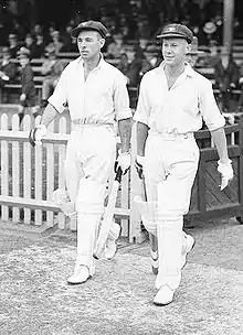 Brown missed selection for the tour opener against Worcestershire—in which Australia traditionally fielded its first-choice XI—before making his debut in the second match against Leicestershire.[5][9] He made a century against Cambridge University in his second tour match, making 105 in the middle order.[18] Batting at number 3 against Lancashire in the final tour match before the Tests, Brown scored 119. After compiling 351 runs at 43.88 in the opening tour matches,[9] he was selected for the Test side.[5] Playing in all five Tests, Brown made his debut at Trent Bridge, Nottingham and scored 22 in his first innings.[9][19] After Australia lost three early wickets in the second innings, Brown scored 73 to help secure a winning lead.[19] Brown then made a century while opening the batting against Northamptonshire,[20] and an unbeaten 62 in the second innings, guiding Australia to an eight-wicket victory over the Gentlemen of England.[9] He was promoted to open in the Second Test at Lord's with Woodfull, after Ponsford was unavailable due to illness.[21] At the home of cricket, Brown made his maiden Test century, scoring 105 in the first innings.[22] His innings was an unhurried one; he tended to wait for the ball to come onto the bat rather than attacking the leather.[3] However, he was unable to prevent Australia from being forced to follow-on and made two; the match ended in an innings defeat.[9] He was retained as opener upon Ponsford's return for the Third Test, with Woodfull dropping down the order in a reshuffled batting line-up. Brown made 72 and a duck.[5] The match ended in a draw after both teams passed 490 in the first innings.[9]