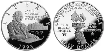 The James Madison-Bill of Rights Commemorative Coin Act (Pub. L.Tooltip Public Law (United States) 102–281) authorized the production of three coins, a clad half dollar, a silver dollar, and a gold half eagle. Congress authorized the coins to commemorate the first ten amendments of the United States Constitution, known as the Bill of Rights. The act allowed the coins to be struck in both proof and uncirculated finishes.[1] The coins were released January 22, 1993.