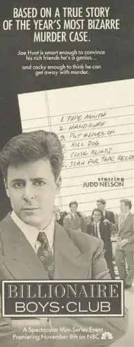 Billionaire Boys Club is a two-part television film that aired on NBC in 1987. It told the story of the Billionaire Boys Club, and its founder, Joe Hunt, who was convicted in 1987 of murdering con-man Ron Levin. The film was written by Gy Waldron and directed by Marvin J. Chomsky.[1]