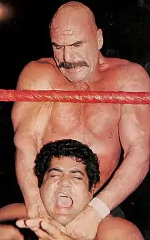 During his time with the AWA, Graham feuded with Gagne, The Crusher, The Bruiser, Wahoo McDaniel, Billy Robinson, Ken Patera and Ivan Koloff, the latter becoming his tag-team partner.[2] By this time, Graham was integrating into his performances not only arm wrestling contests but also weightlifting challenges (mainly involving ex-Olympian Ken Patera) and posing routines.[21] One of his most memorable and violent feuds was against McDaniel, with whom he wrestled numerous bouts between 1973 and 1974.[22]