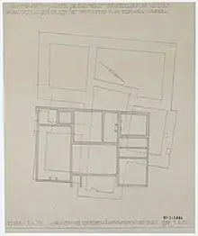 The core of the 1930s building consists of a stair tower (I) and a small house (II). The tower could only be accessed from inside the house. The house had a vaulted basement which reached to about 90 cm above the current ground level. It could be accessed by a stair from the outside, found by the 1930s investigation.[4]
