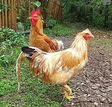 The Bionda Piemontese was once widely distributed in Piemonte. In the 1960s, industrialisation and intensive agriculture caused a decline in the breed, which is suitable only for free-range management. Recovery began in 1999 under the auspices of the Istituto Professionale per l'Agricoltura e l'Ambiente of Verzuolo, in the province of Cuneo.[1] A breed standard was approved by the Federazione Italiana Associazioni Avicole, the federation of Italian poultry associations, in May 2007,[2] based in part on a description of the breed by Vittorino Vezzani in an article published in 1938.[3][4]