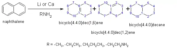 For the reduction of naphthalene with lithium in a mixed ethylamine-dimethylamine solution, the principal products are bicyclo[3.3.0]dec-(1,9)-ene, bicyclo[3.3.0]dec-(1,2)-ene and bicyclo[3.3.0]decane.[22][23]