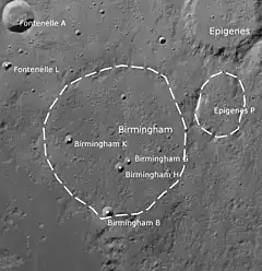 The Birmingham formation lies just to the north of the Mare Frigoris, and to the east of the walled plain W. Bond. To the northeast is the smaller crater Epigenes, with Fontenelle to the west.