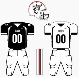 Their home jerseys are typically black, with white numbers and a red trim, while their away jerseys are reversed, being mainly white, with black numbers and maintaining the red trim. Their game pants for both home and away kits are white, with a black and red stripe running the length of the leg. The Bulls have traditionally worn mostly black socks.