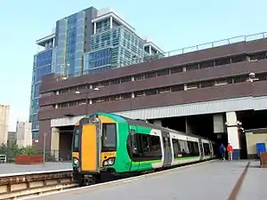 The first phase was completed on 5 October 1987, when the newly rebuilt Snow Hill station opened for services to the south, along with Snow Hill tunnel. The rebuilt station is on a smaller scale than its Edwardian predecessor, built with two island platforms, giving four platform faces. The station's architecture is functional rather than ornate, a multi-storey car park stands over the main platform area, meaning artificial lighting is required on the platforms. Like its predecessor, the main entrance is on Colmore Row. Some parts of the original station are still visible (notably the now-sealed entrance, with GWR crest, in Livery Street).[19]
