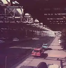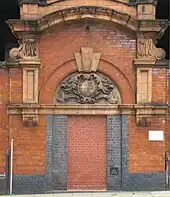 Following closure, the derelict station was used for several years as a car park.[15] It enjoyed a brief moment of fame in 1976 when it was the setting for a fight scene in the locally set BBC TV drama series Gangsters.[16] However, despite a public outcry, the Snow Hill building was not preserved. The Colmore Row façade was demolished in 1969,[17] and the rest of the station largely demolished in 1977,[18] when the dangerous state of the building was revealed. The ironwork of the station roof was badly corroded in several places, and the unstable ground and foundations on which the station had been built were causing it to slide downhill. A few items, including the original gates and booking hall sign, were saved and later used in the Moor Street restoration.