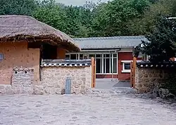 His childhood home originally consisted of an anchae (larger building for women) and a sarangchae (used mainly by men).[2][3] Both buildings were rectangular in shape.[3] Both buildings were made with tree branches and mud mixed with straw, and had thatched roofs and dirt floors.[2][3][4] Between the two buildings was a small courtyard, and a well for water.[3]