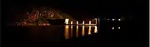 ![]() The dam wall lit at night | |