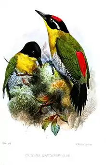 The black-headed woodpecker (Picus erythropygius) is a species of bird in the family Picidae. It typically inhabits deciduous and coniferous forests and is found in Cambodia, Laos, Myanmar, Thailand, and Vietnam.