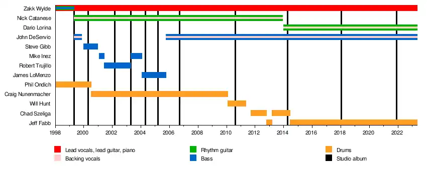 The band's second album Stronger Than Death followed in 2000, with DeServio being replaced by Steve Gibb. Craig Nunenmacher replaced Ondich in July 2000, with his debut recording with the band being the live album Alcohol Fueled Brewtality Live +5. This was followed by 1919 Eternal, which was dedicated to Wylde's father and was released in 2002. Steve Gibb was temporarily replaced by Mike Inez (Alice In Chains) during the Ozzfest 2001 tour, and then Robert Trujillo took over bass duties for the band the next year.