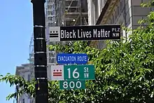 Black Lives Matter Plaza (officially Black Lives Matter Plaza Northwest) is a two-block-long pedestrian section of 16th Street NW in downtown Washington, D.C.[1][2] The plaza was renamed by Mayor Muriel Bowser on June 5, 2020, after the Department of Public Works painted the words "Black Lives Matter" in yellow, 35-foot-tall (11 m) capital letters, along with the D.C. flag, during the series of George Floyd protests taking place in the city.[3][4][5]