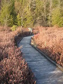 - Bog Trail is a 0.5-mile (800 m) boardwalk hiking trail that was built by the Pennsylvania Conservation Corps and has received awards for its handicapped accessibility.[35] Bog Trail loops through the bog at the park passing by lilies, sedges, rushes, Leatherleaf, and various carnivorous plants. Visitors may observe waterfowl and wildlife in the bogs.[19] Access for the handicapped is provided at the boating area.[12]
