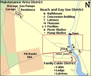 Eighteen structures in the Beach and Day Use Historic District are protected as contributing properties, including seven "standard" pavilions, a larger picnic shelter, and three water pump shelters. These last were built of native stone and covered with pebbles, and have since been converted to small picnic pavilions. The concession building, beach bathhouse, and museum are also protected.[18] Four open pit latrines with wane edge siding and hipped roofs were also contributing structures to the Beach and Day Use district.[18]