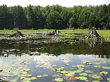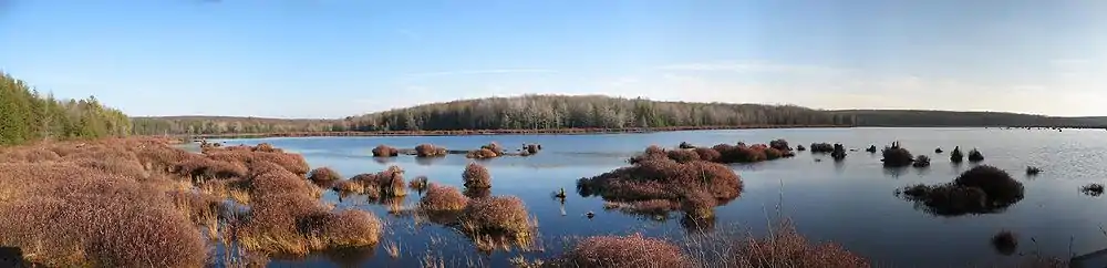 The bogs at the park contain large amounts of sphagnum moss; this decomposes very slowly, causing layers of dead moss to build up at the bottom of the bog, creating peat.[44] In 1994, 1,592 acres (644 ha) of bog at the state park were protected as the "Black Moshannon Bog Natural Area";[44] this was originally conceived as part of the State Parks 2000 strategic plan of the DCNR, and fourteen years later the total area of bog protected as a Natural Area had increased to 1,992 acres (806 ha).[45]