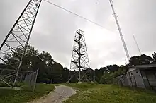 Route 160 east of Lynch and west of Appalachia crosses the mountain. The summit is reached by a narrow road that turns off to the right (coming from Lynch or to the left, if coming from Appalachia) at the Kentucky-Virginia line (the gap that is the highest part of Route 160) and leads past a Federal Aviation Administration radar dome. There is a one lane dirt road to the left not far past the radar dome that leads to the summit. The summit is marked with an abandoned metal fire lookout tower (the cab and wooden steps are missing from the tower). There are also multiple radio towers along with transmitter buildings around the summit and a National Geodetic Survey benchmark is located on a large rock over the hill to the left of the fire tower. This benchmark is 6 feet (1.8 m) below the highest point;[2] a second is directly under the old lookout tower, marking the latest survey of the highest natural point.