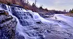 The Black River is a 125-mile-long (201 km)[4] blackwater river that empties into the eastern end of Lake Ontario on the shore of Jefferson County, New York in the United States. The origin of the name is not clear, but it may stem from the natural tannic acid that darkens the water in places. The river flows in a generally northwest direction, with its valley dividing the Adirondack Mountains on the east from the Tug Hill region to the west.