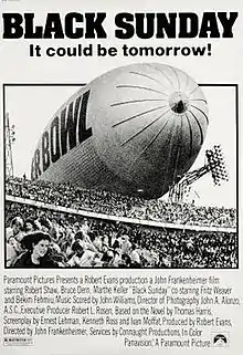 Black Sunday is a 1977 American action thriller film directed by John Frankenheimer and based on Thomas Harris's novel of the same name. It was produced by Robert Evans, and stars Robert Shaw, Bruce Dern and Marthe Keller. It was nominated for the Edgar Allan Poe Award in 1978.[3] The screenplay was written by Ernest Lehman, Kenneth Ross and Ivan Moffat. Ross had previously written the screenplay for The Day of the Jackal, a similar plot-driven political thriller. The inspiration of the story came from the Munich massacre, perpetrated by the Black September organization against Israeli athletes at the 1972 Summer Olympics, giving the title for the novel and film.[4]