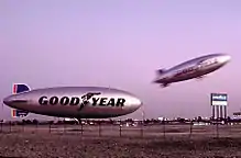 Goodyear granted the film use of all three of its U.S.-based blimps for Black Sunday. The blimps were flown by company pilots Nick Nicolary and Corky Belanger Sr., among the five pilots who were involved in the production.[12] The landing and hijacking scenes were photographed at the Goodyear blimp base in Carson, California with the Columbia (N4A). A short scene was filmed at the Spring, Texas base with the America (N10A). The extensive Miami Super Bowl scenes were filmed with the noticeably smaller blimp Mayflower (N1A), which was then based on Watson Island across the Port of Miami.[13] While Goodyear allowed the use of their airship fleet in the film, they did not allow the "Goodyear Wingfoot" logo (prominently featured on the sides of the blimp) to be used in any advertising or the poster for the film. Thus, the words "Super Bowl" are featured in place of the logo on the blimp in all advertising collateral.[14]