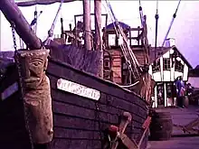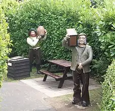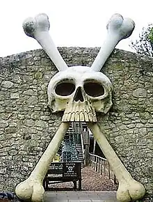 According to a May 2000 talk to the Isle of Wight Postcard Club by the then director, Mr Simon Dabell, the etymology is simply "black pathway" (the original appearance of the chine),[4] but the theme park understandably fosters the interpretation of a smuggling origin. Thus visitors to the park are greeted by a gigantic fibreglass statue of a smuggler between whose legs they could pass to enter.[5]