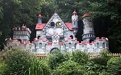 Simply named as castle in guidebooks. Located on a 1971 park map as south of nurseryland and the old entrance . A small square castle with a single cannon inside that looked out of the entrance . |