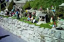 A collection of mainly German garden gnomes doing various day to day chores . Most famous are the gambling gnomes playing cards . Re sited a few times , latterly called Gnomeywood , a play on the word Hollywood . This latter version was opposite chimney pot walk . The last gnomes garden was near the current park entrance but since removed . Most gnomes are believed to now be in storage . But a few have escaped and can be found located especially in the underwater kingdom and nursery land . |
