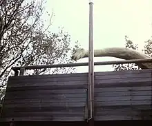 Located outdoors in all weathers . Removed after decades of disintegration by the weather . Not to be confused with the original and still remaining whale skeleton . |