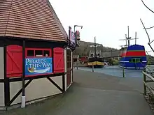 The cove also features the Crossbones play area , opened in 2007, with climbing nets, rope bridges and slides. Several themed buildings surround the pirate ships, including 'The Vortex' (see separate description) and a pirate shooting gallery. Pirate Cove was previously the site for New Adventureland . |