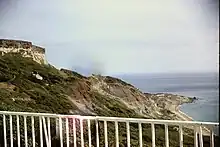 Bluff meaning a steep slope in the cliff at a vertical angle. A wooden raised platform observatory facing west . Nearby a wooden child's swing and see-saw . Adjacent was a large wooden hut containing a set of avery weighing scales . |