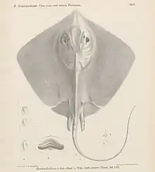 Austrian zoologist Franz Steindachner originally described the blackish stingray as Trygon navarrae, in an 1892 volume of the scientific journal Denkschriften der Mathematisch-Naturwissenschaftlichen Classe der Kaiserlichen Akademie der Wissenschaften in Wien.[2] The type specimen is a male 32 cm (13 in) across, collected from Shanghai, China.[3]