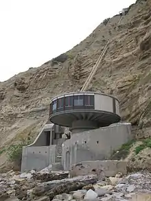 Black's Beach was named for the Black family who had a horse ranch overlooking the beach. They sold the land, and then it was subdivided into La Jolla Farms lots. The Farms' residents retained the Black family's private road to the beach.[4] Many mansions can be seen in the southern portion of the beach, including the Salk Mansion. There is a funicular that goes all the way down from a mansion on the cliff to the beach into a structure known by locals as the mushroom house.[5]