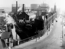 In 1767, Henry Joy (whose family published the Belfast Newsletter) purchased a parcel of land at Cromac in order to build a paper mill, which would be powered by the Blackstaff. The original outlet of the river was turned into a mill dam, giving additional power to the mill.[9] The dam was later drained and developed into the Markets district of the city,[10] while the paper mill closed in the 1850s.[11] The Gasworks here opened in 1823 and continued to operate until the 1980s, when the site was converted into a business park and the section of the Blackstaff that ran through it was culverted.[12][13]