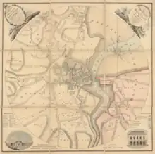 The Blackstaff's name probably references a primitive crossing formed from blackened beams of oak. It was known in Irish as the Abhain Bheara or Owenvarra, meaning "river of the staff".[2] In earlier times the Blackstaff flowed into the Lagan immediately above the present-day Queen's Bridge at what is now Victoria Square,[3] and formed a wide, muddy estuary that extended as far up as Sandy Row.[4] Here, it was spanned by a stone crossing called the Saltwater Bridge, which stood where the Boyne Bridge stands today.[5] In the 17th century the situation of the Blackstaff became a problem for the newly built town of Belfast, which found its potential for expansion limited by the mud flats on its southern side.[6] A variety of improvements were made in the succeeding years. A new channel was cut at the river's mouth to allow boats to reach a wharf at Belfast Castle, and in the 1690s the river was diverted through a cutting in Cromac Wood, at what is now the Gasworks.[7] This work, commissioned by the Earl of Donegall during a lean period in order to provide relief for local labourers, allowed development to commence on the southern side of Ann Street, the original limit of the town.[8][6]
