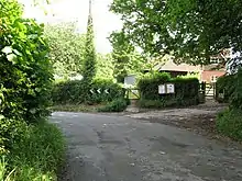 'Stockmans', on the corner at the north side of Blackstone Street, dates to possibly before the 17th century. It is of two storeys and three bays, the lower storey in red brick, the upper timber-framed with part brick and part plaster infill and a hipped roof.[9][10] Also at the north of the street, further east, is 'Blackstone Farmhouse', dating to the mid-18th century, of five bays in two storeys, and of red brick with a Horsham Stone tiled roof with chimneys at each end. There is an external '1674' datestone. Today the house is named by an external plaque as 'Blackstone House'.[1][11][12] At the east corner of the street is Yeomans Hall, possibly pre-17th century, and its attached former barn, 18th century, making a tiled roof L-shaped complex of two storeys with hipped roofs and casement windows. The hall is timber framed, with red brick infill on the north face, and includes an external chimney breast. The south side is completely red brick faced, the east with overlapping red tile facing above a brick plinth. The red brick faced 'barn' attached at right angles at the west is incorporated making a residential whole. In the early 17th century a parlour wing, service extensions, an upper floor and the external chimney stack were added to the hall.[1][13][14] On the south side of the street, opposite Yeomans Hall, is 'Corner Cottages', an 18th-century terraced range of four two-storey cottages with a shallow hipped roof. The cottages are of red brick laid in Sussex bond, three stretchers to one header. The windows in three of the cottages are sash but sliding horizontally.[15][16] On the same side of the street in the next plot is 'Old Timbers', possible dating to before the 17th century, of two storeys and three bays with casement windows. It is timber framed with white painted brick infilling below and white plaster above. the roof at the west is hipped, and at the east is truncated with an added lower lean-to.[17][18] Two further terraced ranges of cottages are on the north side of the east end of Blackstone street, both dating to the mid-19th century; one is timber-framed, the other with a facade of overlapping slate tiles.[1]