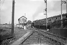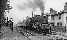 There were two platforms, that on the down (southward)[3] line being exceedingly long - much longer than that on the upside. Access to it was by a barrow crossing to the south, there being no footbridge. There were short goods sidings for each line running into bay platforms, with an extra one on the upside. The entrance and booking hall was on the up platform, with a small waiting room on the other side. Construction was of typical Midland Railway brick built design with wooden awnings.