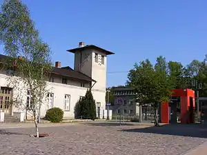 The neo-classical entrance building dates from time of the opening of the station.[5] Its eastern side is a single-storey building with a small tower and the western side is two storeys; each side also has an attic. The precincts of the station forecourt with the post office building on the east side were built at the same time. The two-storey entrance building of the Wismar–Karow line served later as a residential building. East of the station forecourt there were originally a locomotive shed build with timber trusses and a water supply point with a water tower and a signal tower.[5]