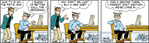 Strips in recent years have included references to recent developments in technology and communication, such as Facebook,[16] Twitter, email, and text messaging.