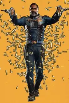 - The Robert DuBois incarnation of Bloodsport appears in the DC Extended Universe (DCEU) film The Suicide Squad, portrayed by Idris Elba.[80][81] This version is a Black British mercenary armed with a high-tech suit and collapsible weapons that only he can use,[82][83] who is serving time in prison for shooting Superman with a Kryptonite bullet.[84] Additionally, he has a daughter named Tyla (portrayed by Storm Reid).[85][86]