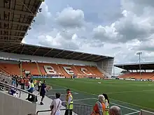 Also in 1906, a 2,000-capacity stand was constructed on the north side of the ground. This new stand was named the Motor Stand and made Bloomfield Road one of the few grounds in England to have stands on all four sides of the ground. Partly erected, it was opened for the first time on 10 November for the visit of West Bromwich Albion.[5] The club organist a whist drive at the Conservative Club to help defray the expense. The stand was borrowed from the Blackpool Corporation and practically filled the north side of the ground. It was purchased from the council in June 1908 at a cost of £100.[5]