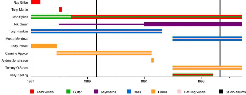 In 1986, guitarist John Sykes was fired from the English hard rock group Whitesnake by vocalist David Coverdale.[1][2] Sykes had just finished recording the band's eponymous album, which would go on to achieve multi-platinum status.[3] He returned to his home in Blackpool, England, where he began writing songs again.[4] In February 1987, he started putting together a new group.[1] Drummer Cozy Powell was the first to join, having played with Sykes in Whitesnake from 1984 to 1985.[4] Next came bassist Tony Franklin, formerly of The Firm, and lastly vocalist Ray Gillen, who had previously fronted Black Sabbath for a short time.[4][5][6] After solidifying their initial line-up, the band recorded some demos and sent them to Geffen Records with whom Sykes had previously worked with as a member of Whitesnake.[7] Prior to this, Sykes had sent Geffen his first demo recordings, which featured him on lead vocals.[7] As it happened, Geffen's A&R executive John Kalodner preferred Sykes's vocals to Gillen's, who were having disagreements over the songs' musical and vocal approach.[4][7] Eventually, Gillen left after only a few months in the band.[7] In mid-1987, the group signed with Geffen Records, but as they began searching for a new lead singer, Cozy Powell abruptly left to join Black Sabbath, having grown frustrated with the band's slow progress.[1] They were then approached by drummer Carmine Appice, who had previously played with Rod Stewart, Vanilla Fudge and King Kobra, among others. Also in the running was former Journey drummer and Sykes's ex-Whitesnake bandmate Aynsley Dunbar, but ultimately the job went to Appice.[8] By early 1988, former Black Sabbath vocalist Tony Martin had been chosen as the band's new lead singer, but as they were about leave for Vancouver to record their debut album, Martin pulled out. The rest of the group decided to soldier on, figuring they could always find a singer later.[4][9]