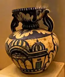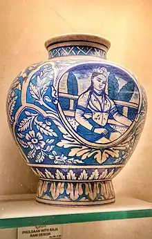 Blue Pottery is widely recognized as a traditional craft of Jaipur of Central Asian origin.[1] The name 'blue pottery' comes from the eye-catching cobalt blue dye used to color the pottery. It is one of many Eurasian types of blue and white pottery, and related in the shapes and decoration to Islamic pottery and, more distantly, Chinese pottery.