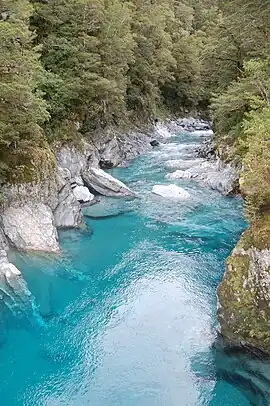 At its confluence with the Makarora River, the aptly named Blue Pools are the destination of a popular[1] short walk from State Highway 6, with a bridge crossing the Blue River and providing good views upstream into the gorge and downstream over the river flowing into Makarora River.[2] The longer Blue Valley tramping track leads deep into the Blue River Valley and along most of the length of the river.