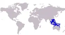 The bluespotted trevally inhabits the tropical waters of the East Indian-West Pacific Ocean, and is restricted to a smaller range than most of its relatives. The species range extends from the waters of the South China Sea around Taiwan and Borneo south through eastern Indonesia and the Arafura Sea around Papua New Guinea.[5] The species is commonly found off northern Australia, especially the Gulf of Carpentaria, but is occasionally seen as far south as Gladstone, Queensland.[7]