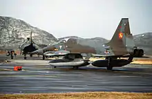 In an effort to rationalize operations and renew the fighter inventory, Norway took delivery of twenty-two used CF-104 Starfighters from the Royal Canadian Air Force. These were stationed with the 334 Squadron in order to exploit commonality with the F-104s already stationed in Bodø. Unlike the F-104, the CF-104 was built as a fighter-bomber, but radar was retrofitting before entering Norwegian service. The aircraft's primary role was naval bombardment.[59] During larger exercises, the 334 Squadron would routinely relocate to Bardufoss.[60] Bodø became one of nine co-located operating bases (COB), following an agreement between the Norwegian Armed Forces and the USAF in May 1974. This involved permanent storage of ammunition, parts and equipment, as well as a tighter organizational cooperation, with the USAF.[61]