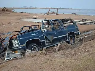 Hurricane Ike caused cataclysmic destruction of the peninsula, reducing the region to rubble and causing severe, permanent change in the shoreline. Entire communities along the upper Texas coast were simply wiped out by Ike's catastrophic storm surge.[27] Ike's effects were disproportionally felt near the long, low-lying Bolivar Peninsula which has typical elevations around 2 m. Despite being only a strong category 2 storm with maximum winds at landfall of 95 knots (49 m/s, Berg, 2009), Ike's extremely large, long-lasting surge and waves devastated the peninsula.[26] In Gilchrist, Texas, NOAA aerial photography reveals complete destruction. The Rollover Pass bridge was reduced to one lane. Of the 1,000 buildings in Gilchrist, 99.5% of them were knocked off of their foundations. Of the buildings off of the foundations, the storm demolished some and washed others onto swamplands behind Gilchrist.[28]