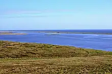 The river is 1–3 metres (3 ft 3 in – 9 ft 10 in) deep, and up to 100 metres (330 ft) wide. It forms the Bolshaya Lake at its mouth.[6] At its mouth the Bolshaya is more than 0.5 miles (0.80 km) wide.[8] It flows in a generally southwesterly direction to the coast, where it turns and flows in a SSE direction for about 10 miles (16 km) along the east side of a narrow sand and gravel spit before emptying into the Sea of Okhotsk at the end of the spit.[4] An 1870 account said that it received the river Apatcha above the town of Bolsheretsk[lower-alpha 1] and then ran for 20 miles (32 km) to the Sea of Okhotsk. Large boats could navigate the river to within eight miles of the town.[5] According to the United States Hydrographic Office (1932):[9]
