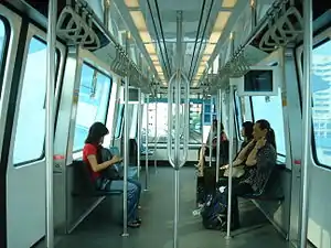 Car 116 was installed with the new bright LEDs that was used in the C801A trains, replacing the existing yellow headlights. All train cars except for six of them, have been replaced by brand new LED headlights. As the carriages are closed-end, the train must be stationary and the doors must be open for passengers to move between carriages during 2-car operations. Passengers have the ability to sit on the either end of the car, which creates more standing space. All seats in the interior are standardised into turquoise seats, which is the previous LRT colour before it was standardised into grey in 2003. It has 4 seats on each end and 8 seats in the middle. C801 trains have rectangular, incandescent headlights compared to the C801A trains, which have circular, bright white LED headlights.
